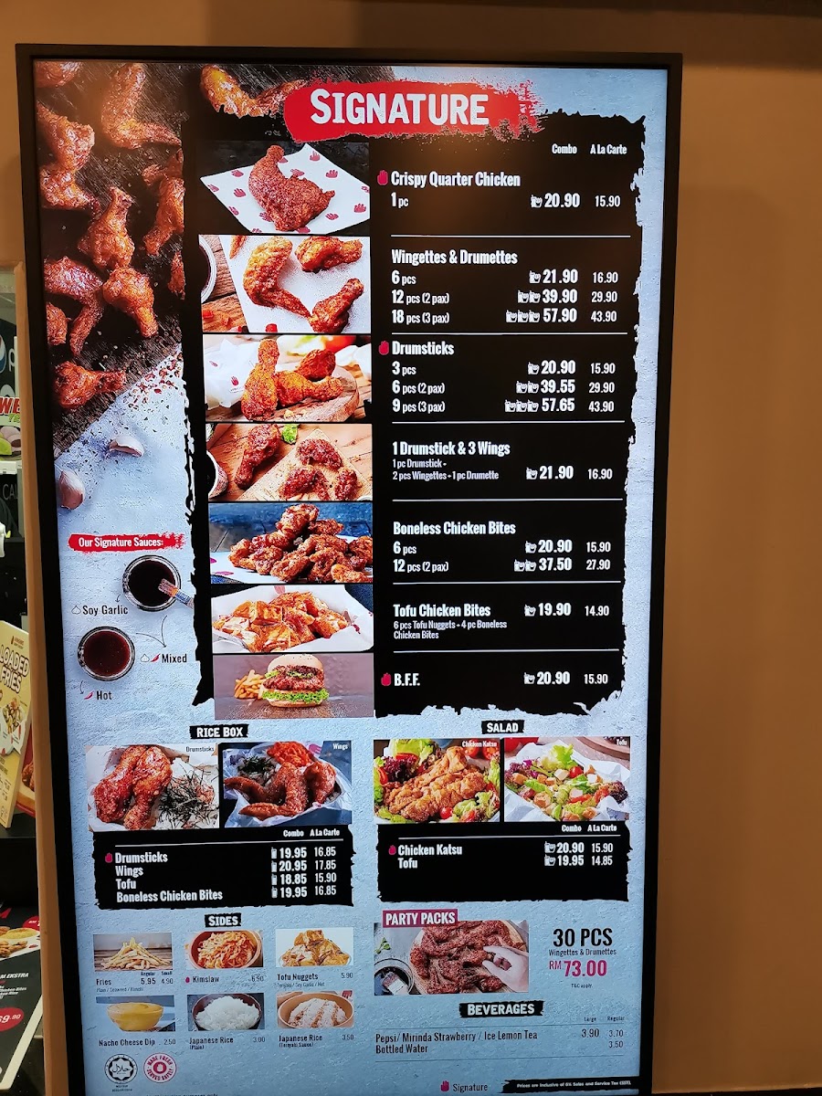 Wingettes & Drumettes: This category features the signature chicken wings and drumsticks available in various portion sizes, including larger sharing options such as the Party Platter, which contains 30 pieces of Wingettes and Drumettes.